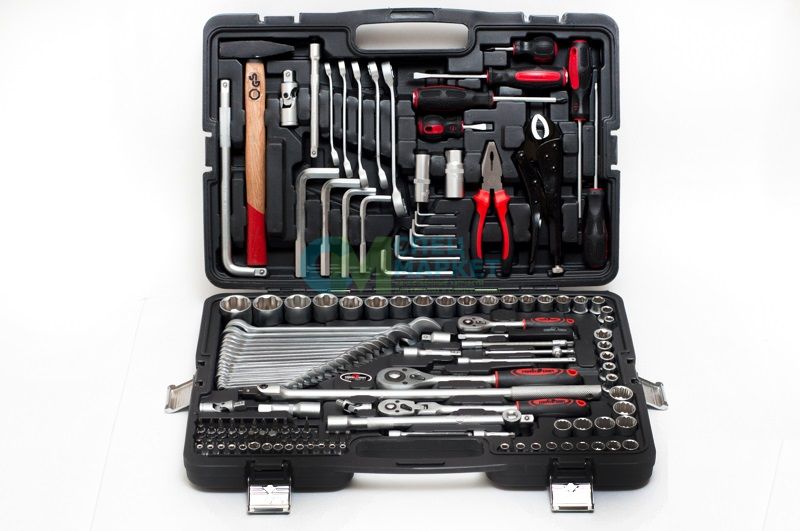 Элементы набора упакованы в чемодан, изготовленный из пластика 1-й пробы, имеет металлические прочные замки, а также удобную ручку для транспортировки. Для удобства поиска все детали аккуратно рассортированы по специальным обозначенным отсекам. Чемодан защищает инструменты от пыли, влаги и повреждений. Габариты чемодана (длина*ширина*высота*глубина): 590*400*75 мм.