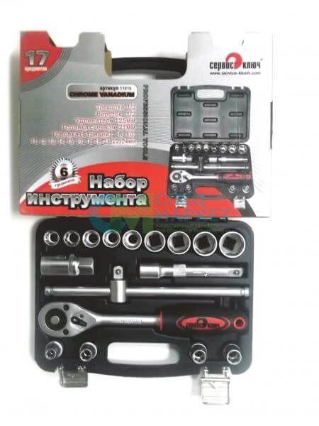 Набор инструментов СЕРВИС КЛЮЧ 17 предметов – это небольшой комплект распространённых инструментов для обслуживания и ремонта различной техники, оборудования и транспорта. Набор включает в себя трещотку, Т-образный вороток, головки и приспособления к некоторым элементам. Он подойдет как для домашнего использования, так и для профессиональной работы в мастерской, гараже или на производстве.