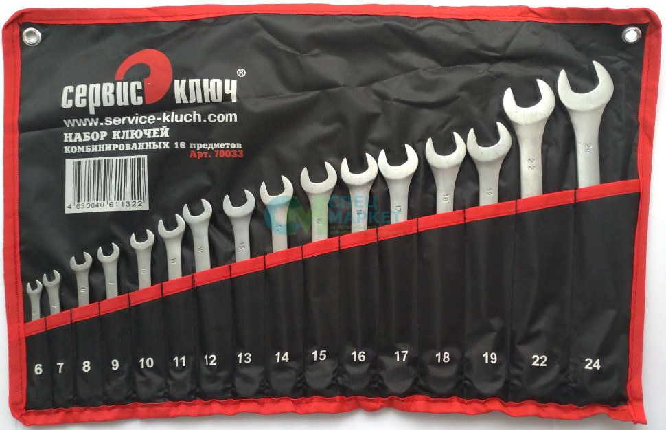 Ключи поставляются в удобной фирменной сумке (выполнена из прочного и водоотталкивающего материала, который защищает инструмент от пыли и влаги), в которой каждый ключ помещен в свой кармашек с написанным размером. Удобство чехла в том, что вы можете не только носить или возить с собой, но и повесить на стену за счет специальных отверстий. Данный набор произведен на индийском заводе. Габариты набора – 290*90*70 мм, вес - 1760 гр.