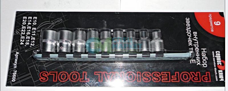 Набор головок внутренних звездочек головок типа Е, 9 предметов. Упаковано в блистер на металлической подложке-держателе. Описание: 1/2 (Е10, Е11, Е12, Е14, Е16, Е18, Е20, Е22, Е24). Изготовлен из высококачественной стали 50bv30.