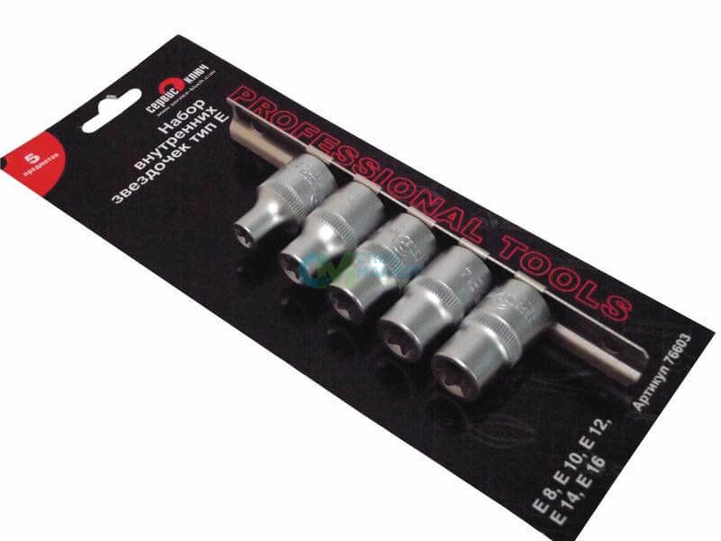 Набор головок внутренних звездочек головок типа Е, 5 предметов. Упаковано в блистер на металлической подложке-держателе. Описание: 1/2 (Е8, Е10, Е12, Е14, Е16). Изготовлен из высококачественной стали 50bv30.